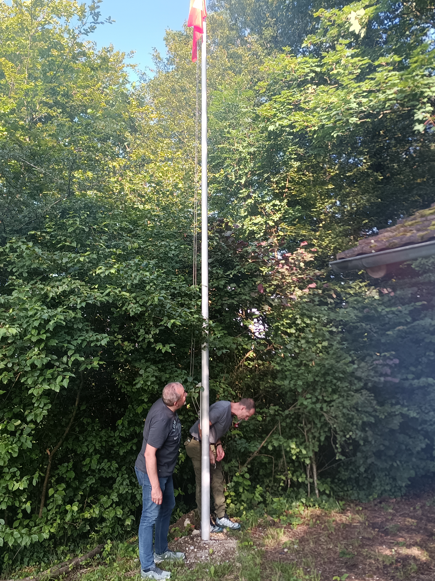 Unsere Schutzhütte mit Grillstelle in der "Staag" hat eine Fahnenstange erhalten. Verdankenderweise wurde diese Von Walter Monhart und sinem Sohn Beat gespendet. Kurzerhand wurde die Alustange von den beiden Bürgern, auch gleich mit einem Fundament versehen, in den Boden eingelassen.