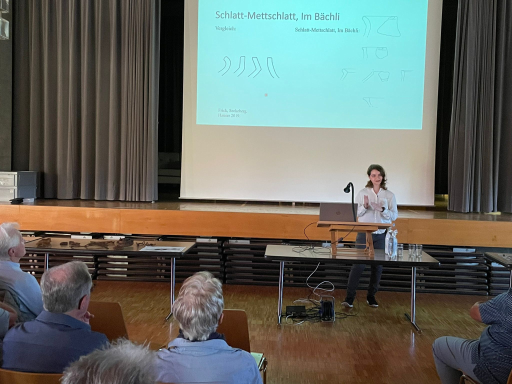 Ca. 90 Personen folgten der Einladung um 18.30 Uhr ins Gemeindehaus. Der Bürgerpräsident, Beat Möckli, eröffnete den Anlass mit einer Begrüssung der Anwesenden und übergab das Wort an die Archäologin Nadine Moosmann. Sie referierte über die bronzezeitliche Fundstelle «Im Bächli» in Mettschlatt, deren Auswertung Teil ihrer Masterarbeit war. Die Fundstelle wurde im Zuge des Neubaus einer Einstellhalle im Jahr 2020 entdeckt und damals mit einer archäologischen Notgrabung dokumentiert. Im Jahr 2022 fand dort nochmals eine Grabung statt. Das Fundspektrum dieser Grabung reicht von 7000 v. Chr. bis heute. Nadine Moosmann konzentrierte sich in ihrer Masterarbeit im Speziellen auf den Befund der Bronzezeit (2200-800 v. Chr.). Um die Ergebnisse in den überregionalen Kontext zu setzen, zog sie auch noch Fundstellen aus den Nachbarkantonen hinzu. Ihre Visualisierung zeigte kontinuierliche Aktivitäten in der ganzen Region rund ums Schlattertal, wobei hier eher von Siedlungen aus dem Umland Acker- und Feldbau betrieben wurde, so die Theorie. Die präsentierten Originalfunde bestehend aus Keramik- und Metallobjekten sowie Bernstein- und Glasperlen fanden beim Publikum Anklang. Diese Funde sind auch der Beweis für eine europaweite Handelstätigkeit in dieser Zeit.