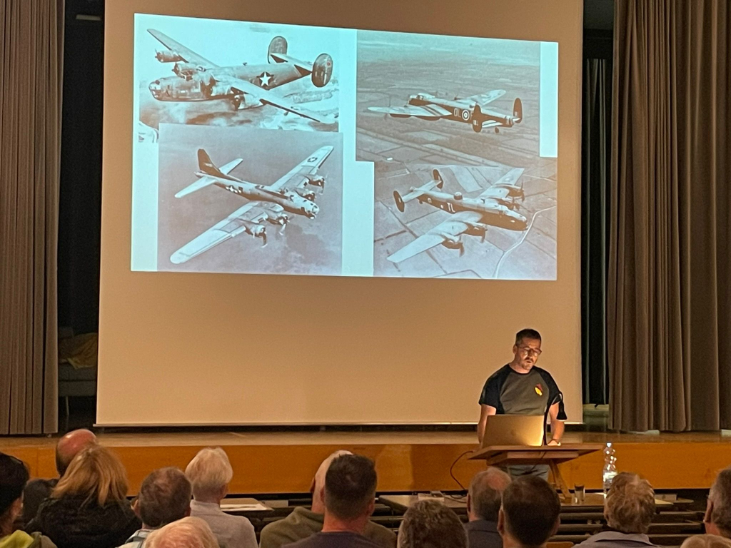 Ein weiteres lokalhistorisches Ereignis wurde im Anschluss von Beat Möckli dem Publikum nähergebracht. Am 1. April 1944 bombardierten Flugzeuge der 8. USAAF (US Army Air Force) die Stadt Schaffhausen. Die Ursache für die Bombardierung ist heute weitgehend erforscht und aufgearbeitet. Weniger bekannt ist, dass auf Schlatter Gemeindegebiet zahlenmässig gleich viele Bomben niedergegangen sind wie in Schaffhausen. Die Resultate von Nachforschungen in verschiedenen Archiven und im Gelände ergaben einige lokale Geschehnisse, welche dem Publikum präsentiert wurden. Diese reichen von noch sichtbaren Bombenkratern im Wald, über durchgegrabene Sprengtrichter beim Gasleitungsbau bis zu einem zeitgenössischen Polizeibericht, der vom Unfug mit einem Brandbombenblindgänger berichtet. Auf einem Tisch lagen unansehnlich verrostete Metallteile, welche sich als Überreste von Spreng- und Brandbomben herausstellten. Einzelteile lassen sich sogar aufgrund von Schnittzeichnungen den Bombentypen zuweisen.