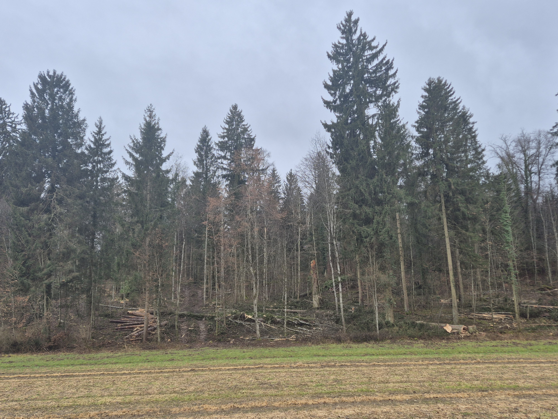 Nach Jahren der unkalkulierbaren Käferholzerei und dem Fällen von kranken Eschen, können wir nun wieder in die reguläre Durchforstung übergehen. Förster Simon Pachera teilt dabei unseren gesamten Wald in sogenannte Bewirtschaftungseinheiten auf. Diese Massnahme lässt eine koordinierte und rationelle Bewirtschaftung zu. Eine solche Einheit enthält Teilflächen in veschiedenen Wachtumszuständen, welche entsprechend durchforstet werden müssen. Bei jüngeren Beständen ist eine Durchforstung mit Rücksicht auf die Förderung von Zukunftsbäumen nötig. Das selbe Vorgehen wird auch in älteren Beständen mit ca 50-60 jährigen Bäumen angewandt. Wir besitzen aber auch Flächen, welche stufig bewirtschaftet werden. Bäume, die das Nutzungsalter erreicht haben, werden aus dem Bestand herausgenommen und der Rest bleibt als Wald aller Altersgruppen und Wuchshöhen bestehen. Die Holzerei wird bei uns durch mehrere Varianten ausgeführt. Es kommt eine rein maschinelle Holzernte mit dem Harvester und dem Rückefahrzeug zum Einsatz. Aber auch die herkömmliche, seilwindenunterstützte Handfällung kommt zur Anwendung. In ganz jungen Beständen kann die Erstdurchforstung rein manuell mit der Säge durchgeführt werden.