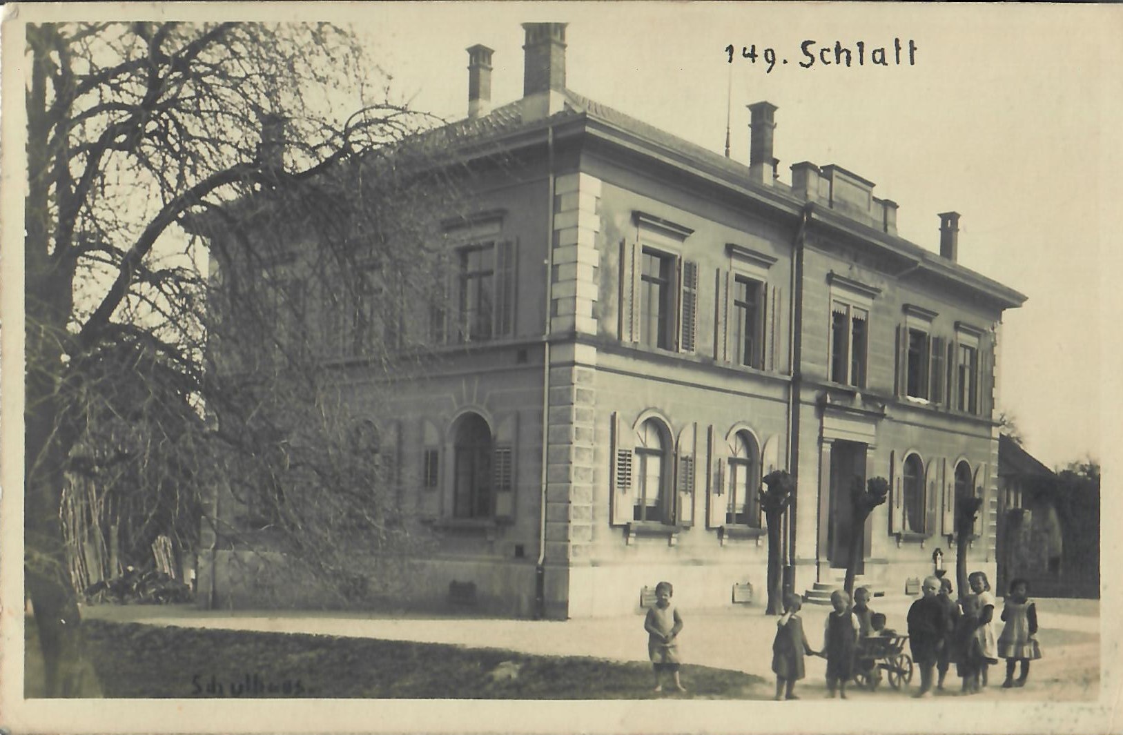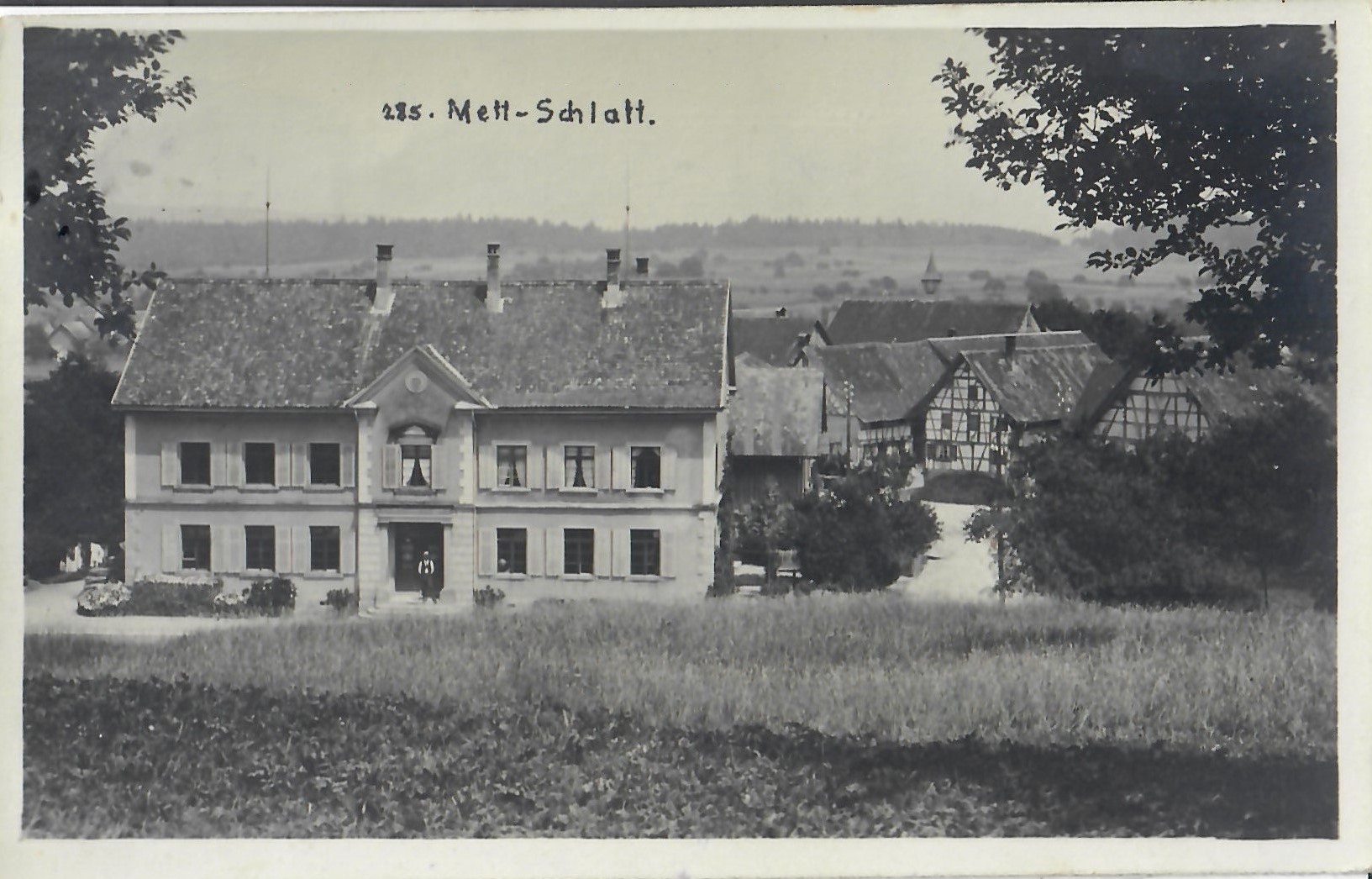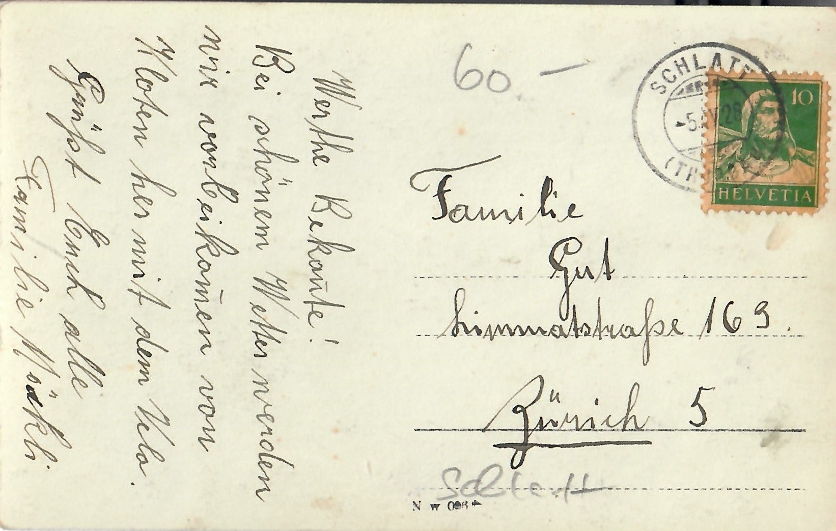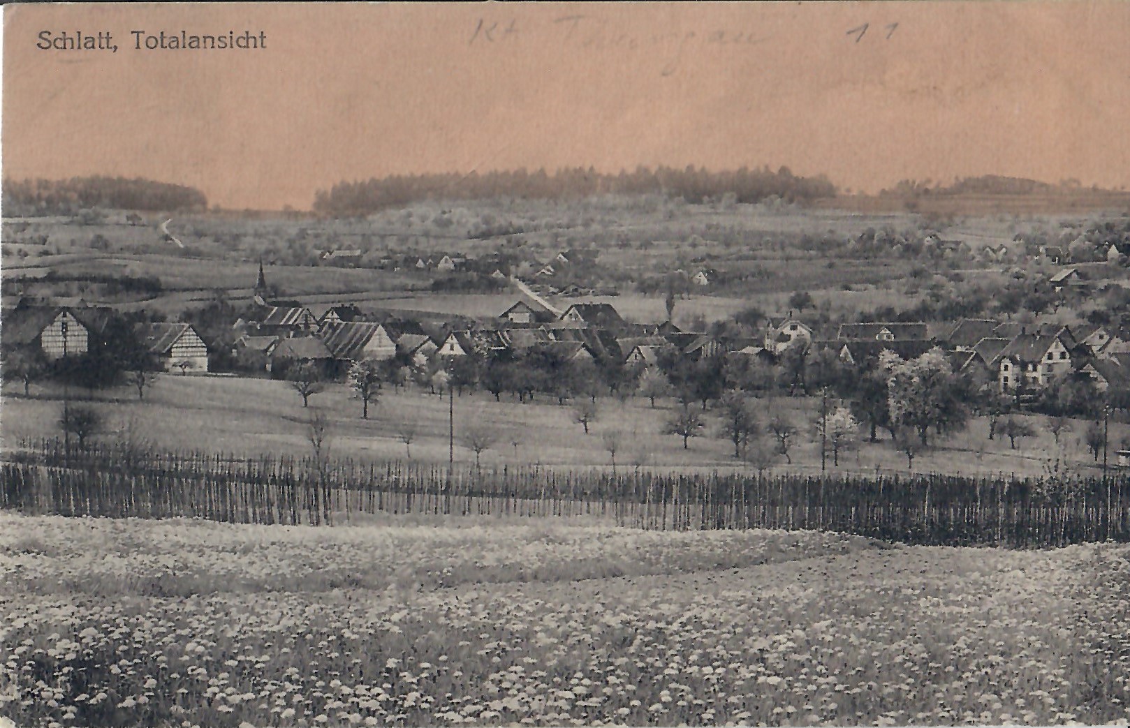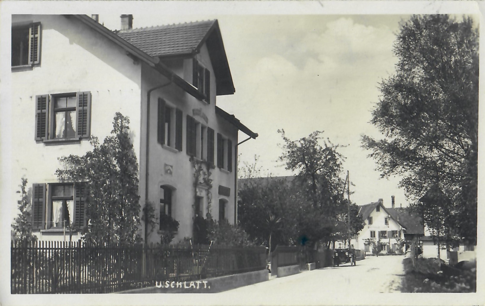 In diesem Kapitel sehen Sie historische Ansichtskarten mit Sujets aus dem Gemeindegebiet von Schlatt. Die Karten sind teilweise über 100 Jahre alt. Sie wurden in die ganze Welt verschickt. Den weitesten Weg hinter sich hat eine Karte, welche bis nach Pittsburg, USA, und wieder zurück fand. Ansichtskarten hatten früher die Funktion, welche heute SMS oder whatsapp Nachrichten übernehmen. Man schickt sich schnell eine Nachricht wie; "Hallo es geht mir gut", "Ich komme um 15.30 Uhr bei euch an" oder "Hier meine neue Adresse" und ähnliches. Bemerkenswert ist, dass innerhalb der Schweiz versendete Ansichtskarten schon vor mehr als 100 Jahren bereits nach einem Tag bei dem/der Empänger/in ankamen! Hier sehen Sie die Sammlung B. Möckli. Diese wird laufend erweitert und ergänzt.