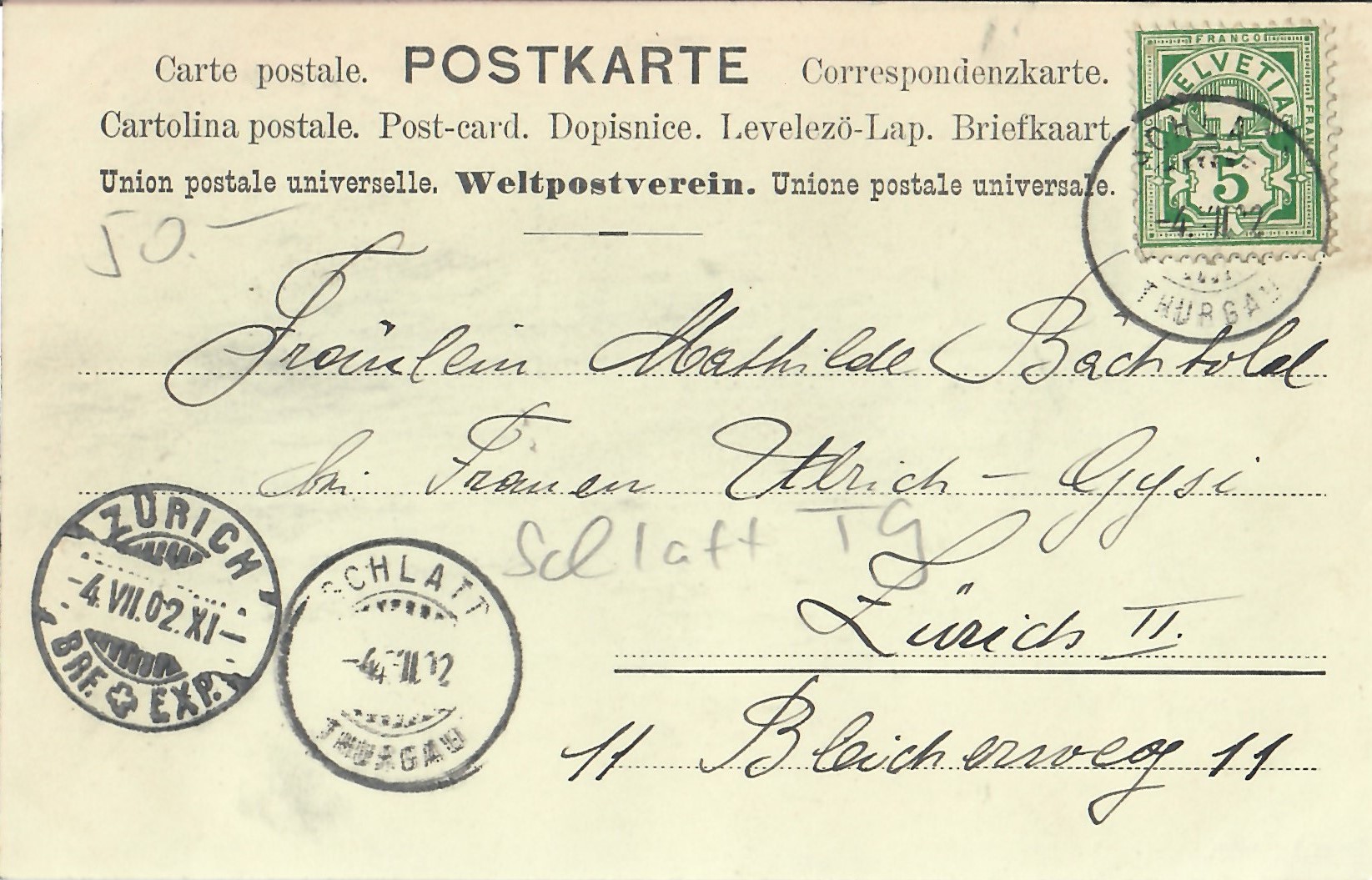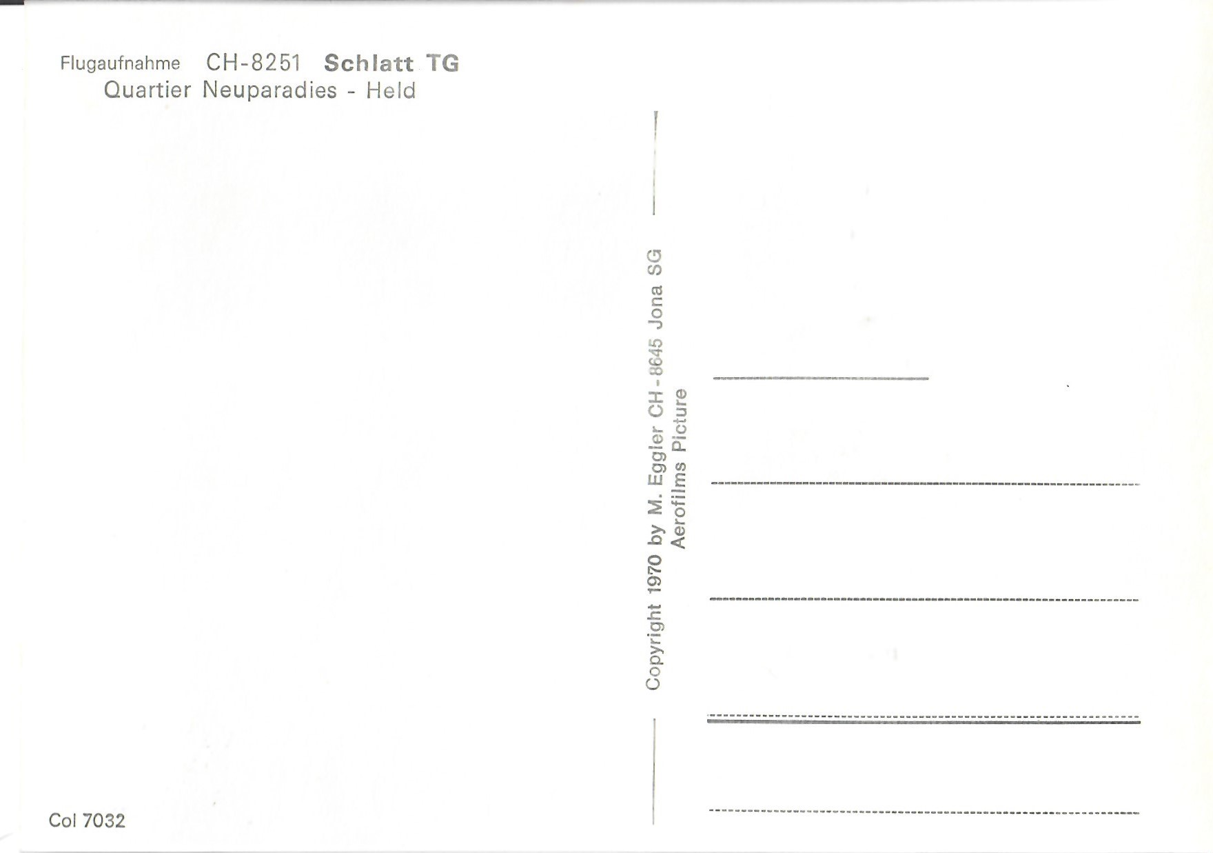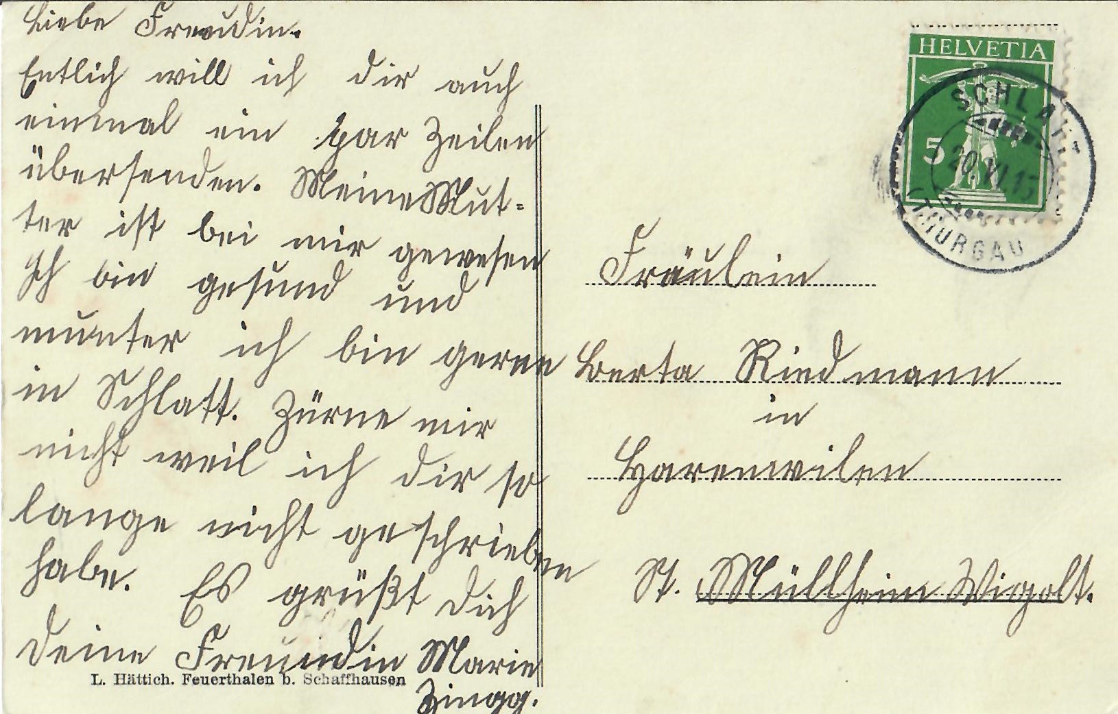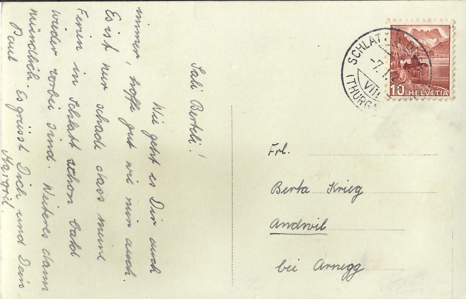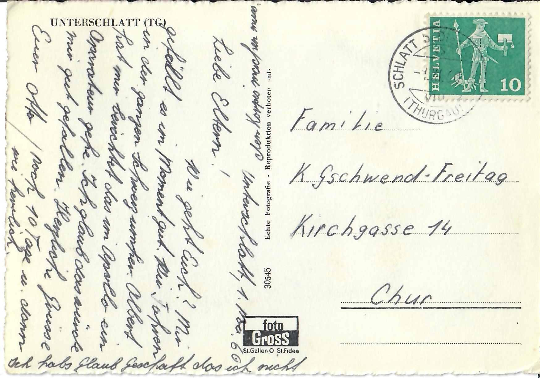 In diesem Kapitel sehen Sie historische Ansichtskarten mit Sujets aus dem Gemeindegebiet von Schlatt. Die Karten sind teilweise über 100 Jahre alt. Sie wurden in die ganze Welt verschickt. Den weitesten Weg hinter sich hat eine Karte, welche bis nach Pittsburg, USA, und wieder zurück fand. Ansichtskarten hatten früher die Funktion, welche heute SMS oder whatsapp Nachrichten übernehmen. Man schickt sich schnell eine Nachricht wie; "Hallo es geht mir gut", "Ich komme um 15.30 Uhr bei euch an" oder "Hier meine neue Adresse" und ähnliches. Bemerkenswert ist, dass innerhalb der Schweiz versendete Ansichtskarten schon vor mehr als 100 Jahren bereits nach einem Tag bei dem/der Empänger/in ankamen! Hier sehen Sie die Sammlung B. Möckli. Diese wird laufend erweitert und ergänzt.