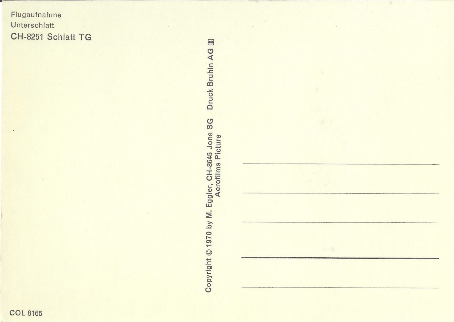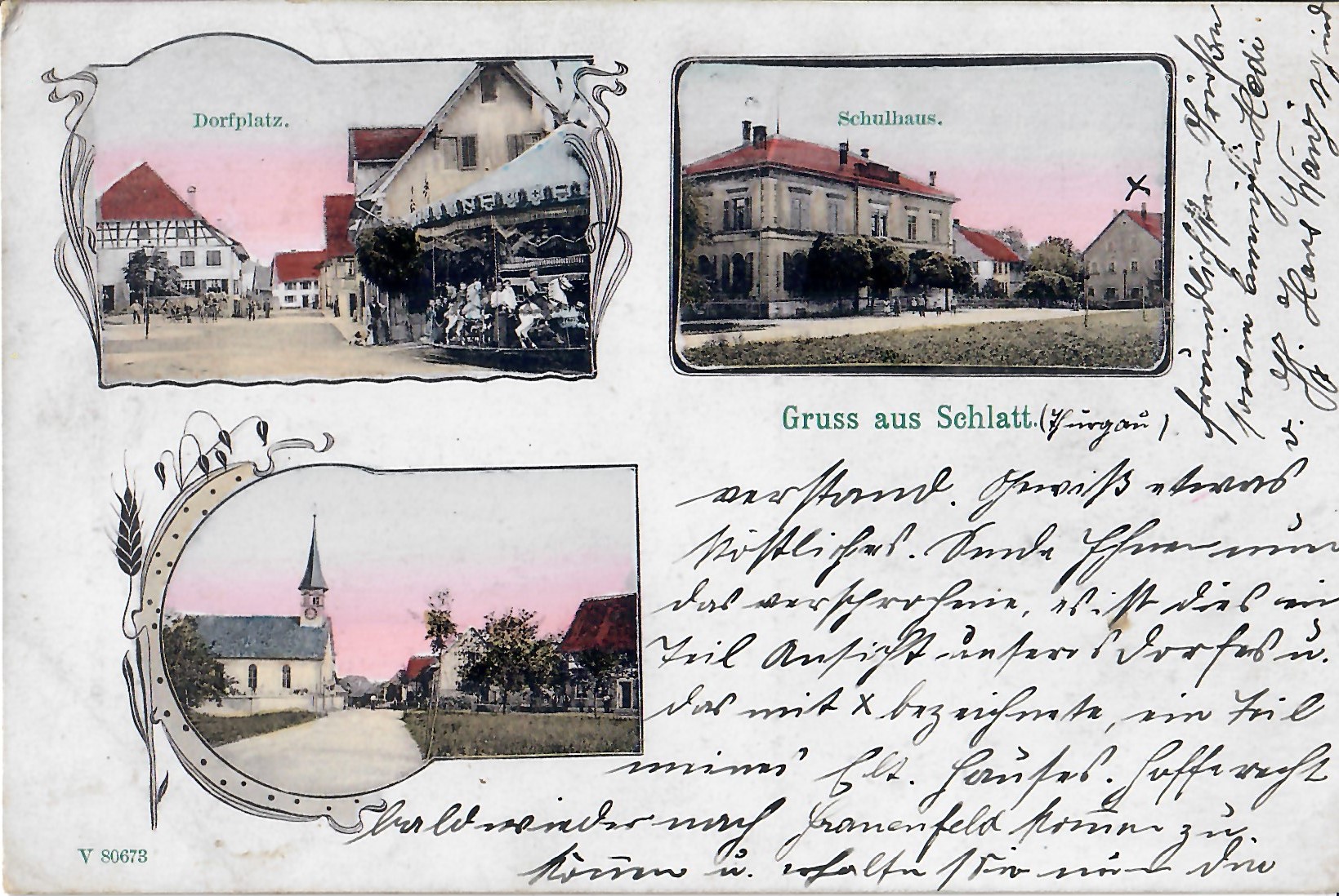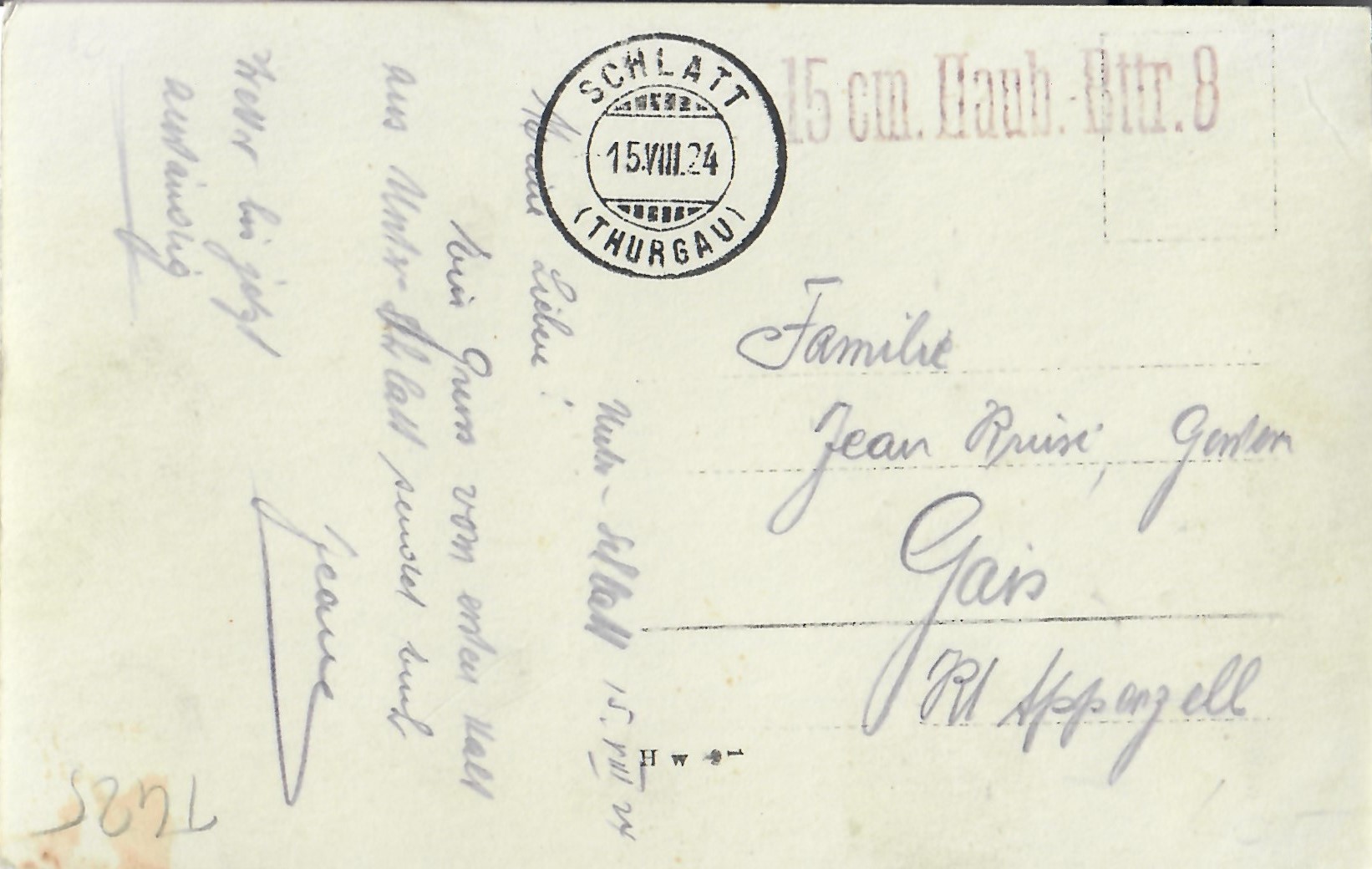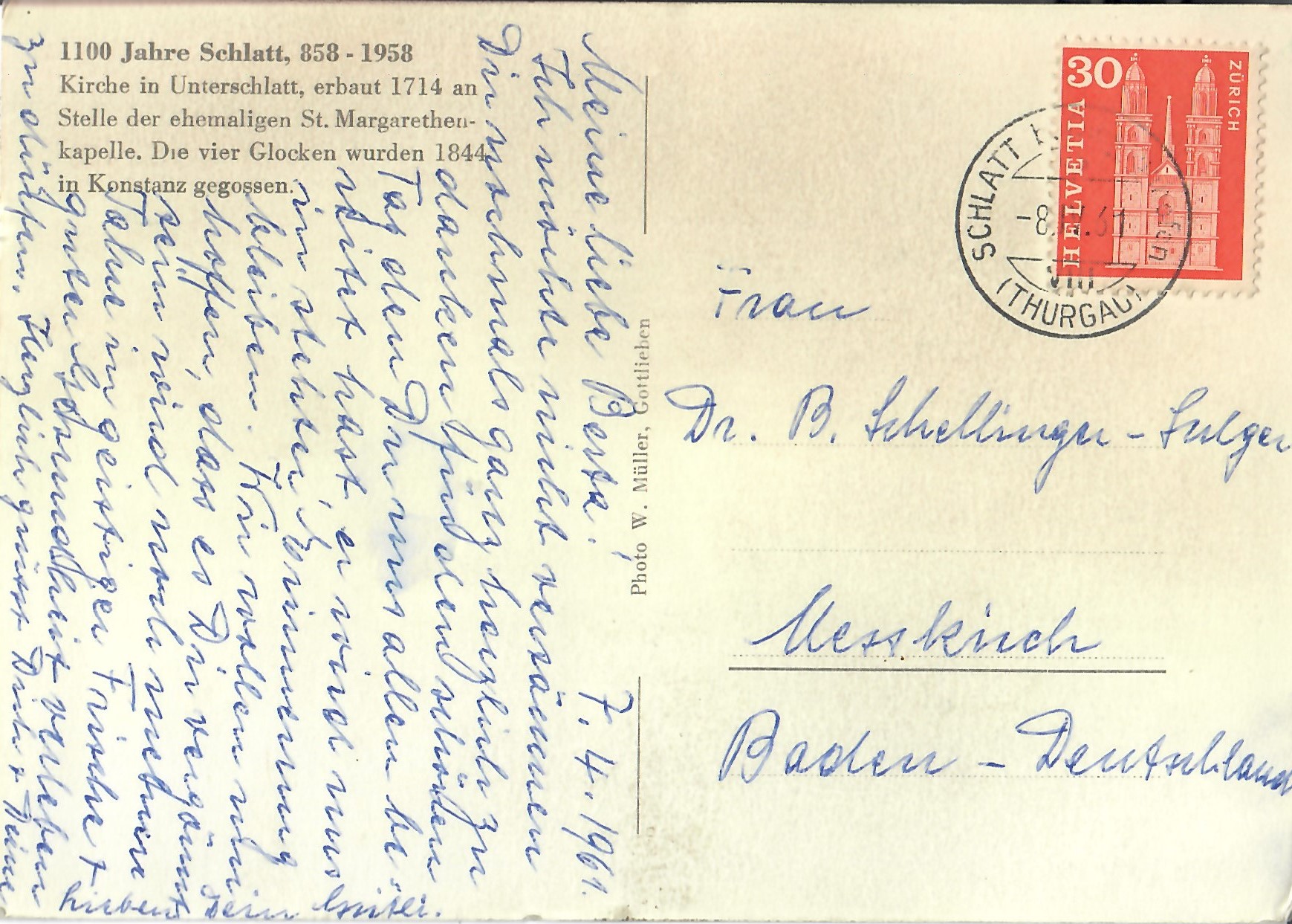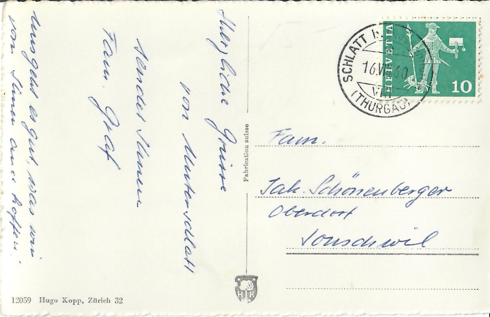 In diesem Kapitel sehen Sie historische Ansichtskarten mit Sujets aus dem Gemeindegebiet von Schlatt. Die Karten sind teilweise über 100 Jahre alt. Sie wurden in die ganze Welt verschickt. Den weitesten Weg hinter sich hat eine Karte, welche bis nach Pittsburg, USA, und wieder zurück fand. Ansichtskarten hatten früher die Funktion, welche heute SMS oder whatsapp Nachrichten übernehmen. Man schickt sich schnell eine Nachricht wie; "Hallo es geht mir gut", "Ich komme um 15.30 Uhr bei euch an" oder "Hier meine neue Adresse" und ähnliches. Bemerkenswert ist, dass innerhalb der Schweiz versendete Ansichtskarten schon vor mehr als 100 Jahren bereits nach einem Tag bei dem/der Empänger/in ankamen! Hier sehen Sie die Sammlung B. Möckli. Diese wird laufend erweitert und ergänzt.