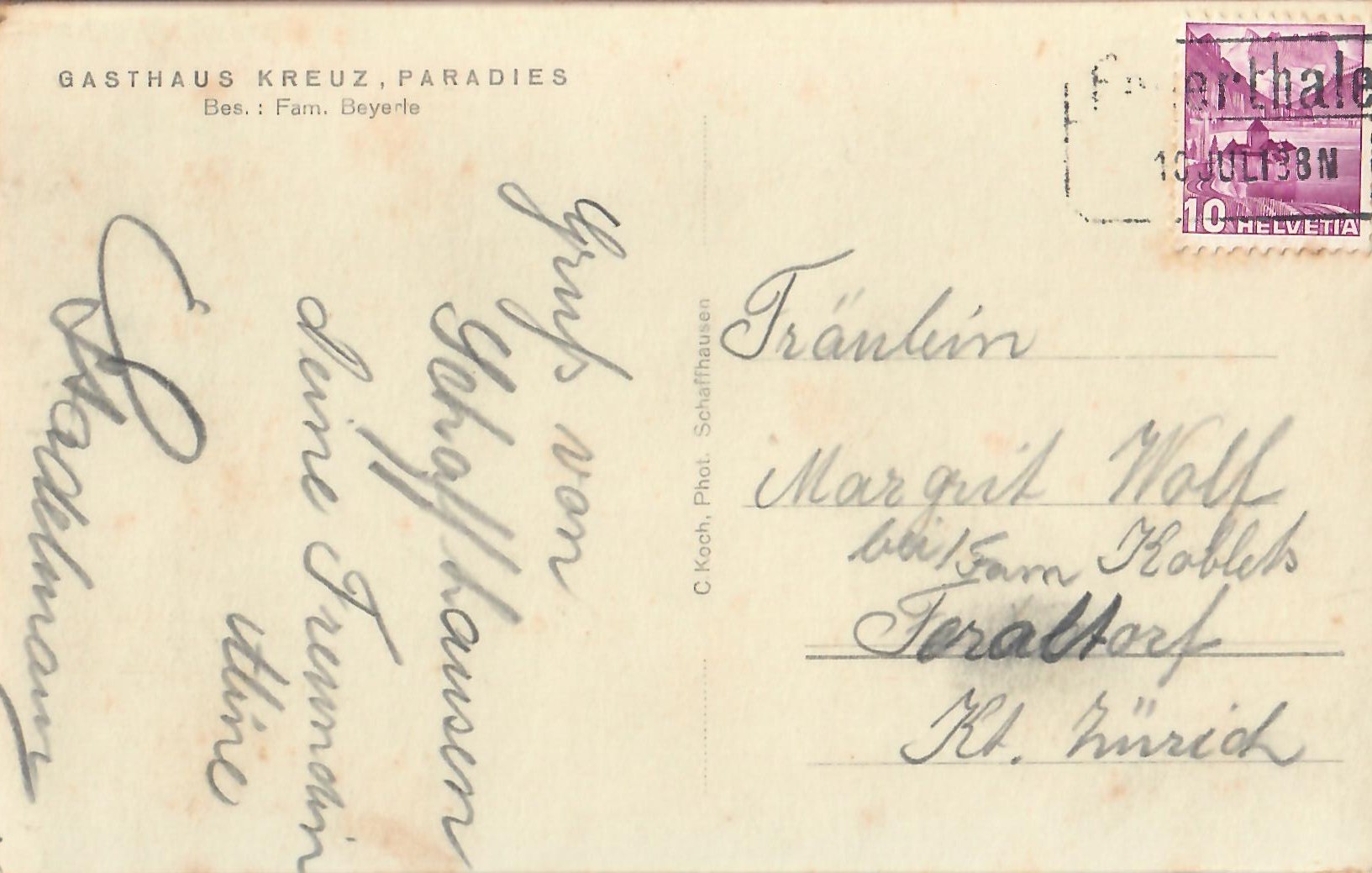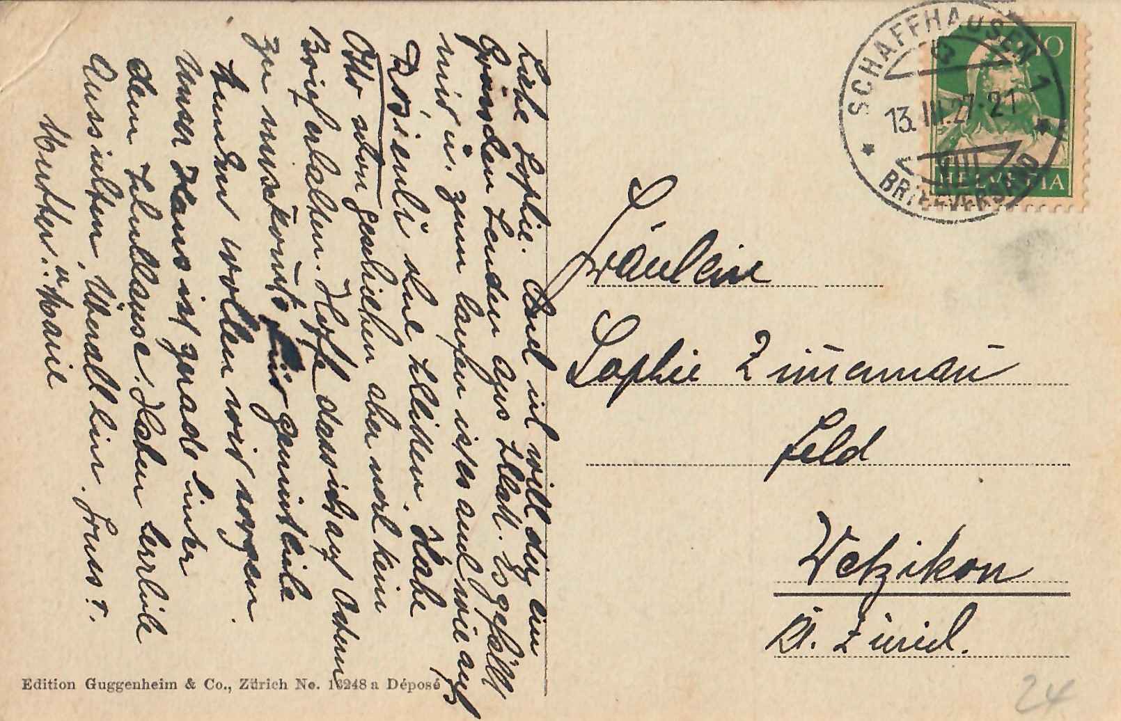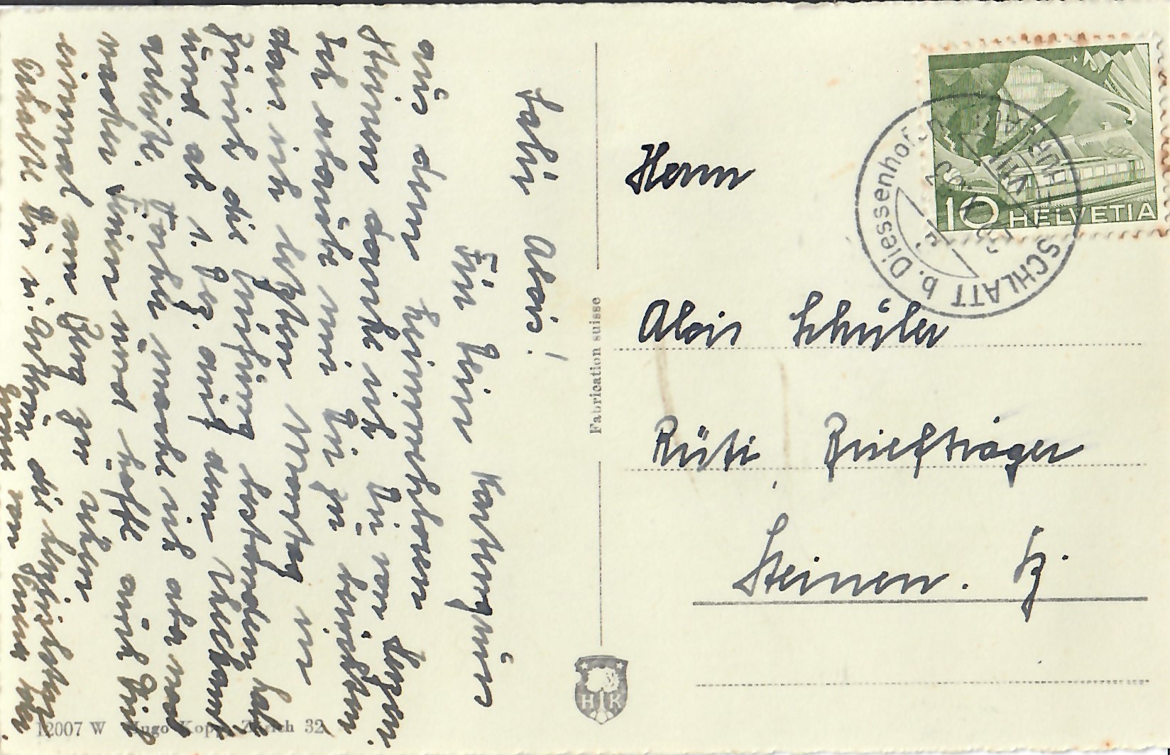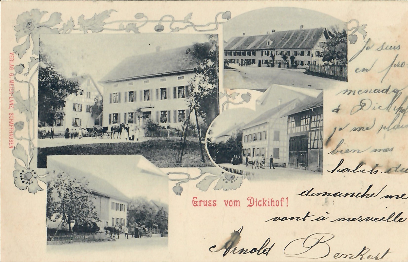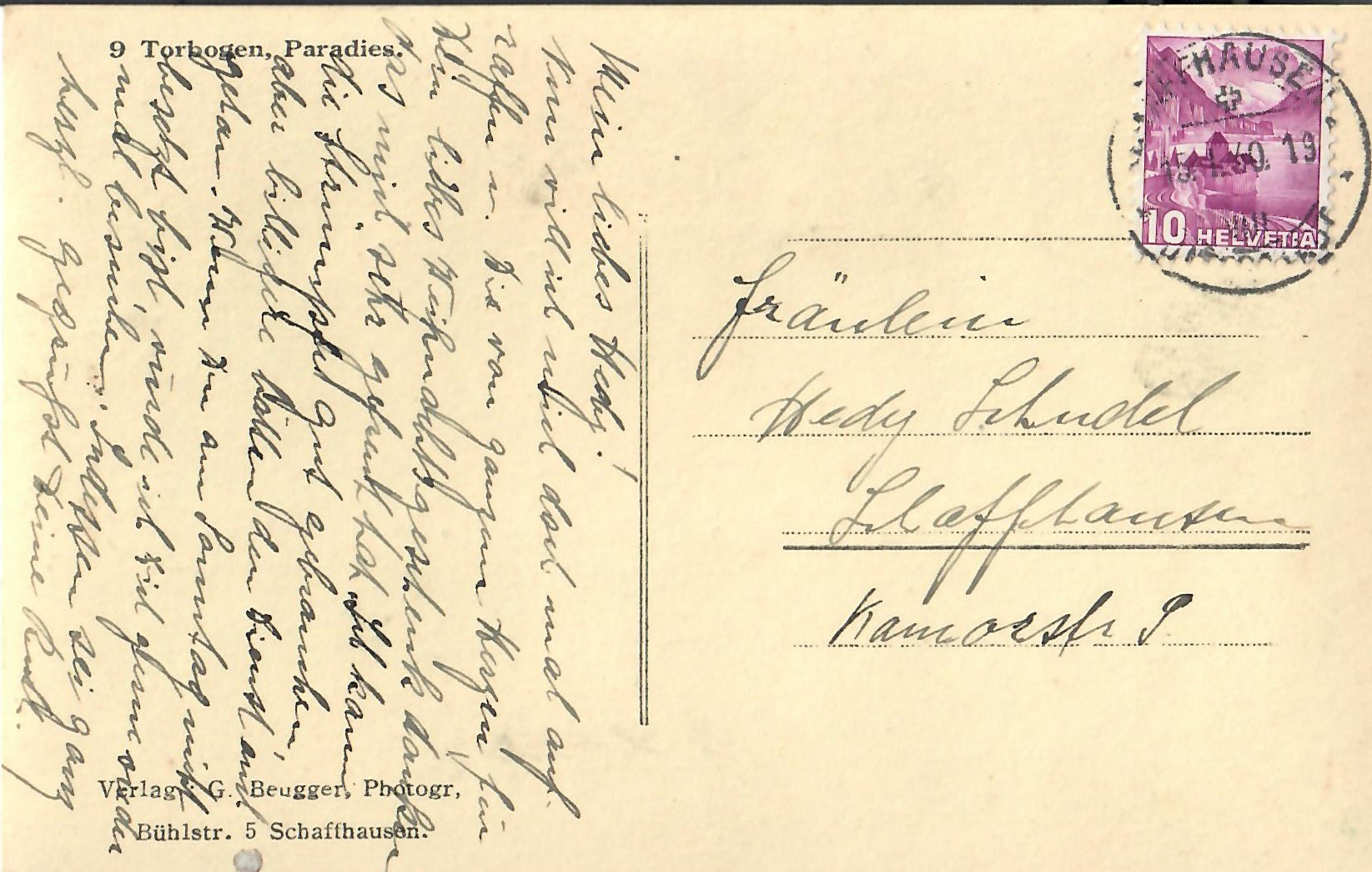 In diesem Kapitel sehen Sie historische Ansichtskarten mit Sujets aus dem Gemeindegebiet von Schlatt. Die Karten sind teilweise über 100 Jahre alt. Sie wurden in die ganze Welt verschickt. Den weitesten Weg hinter sich hat eine Karte, welche bis nach Pittsburg, USA, und wieder zurück fand. Ansichtskarten hatten früher die Funktion, welche heute SMS oder whatsapp Nachrichten übernehmen. Man schickt sich schnell eine Nachricht wie; "Hallo es geht mir gut", "Ich komme um 15.30 Uhr bei euch an" oder "Hier meine neue Adresse" und ähnliches. Bemerkenswert ist, dass innerhalb der Schweiz versendete Ansichtskarten schon vor mehr als 100 Jahren bereits nach einem Tag bei dem/der Empänger/in ankamen! Hier sehen Sie die Sammlung B. Möckli. Diese wird laufend erweitert und ergänzt.