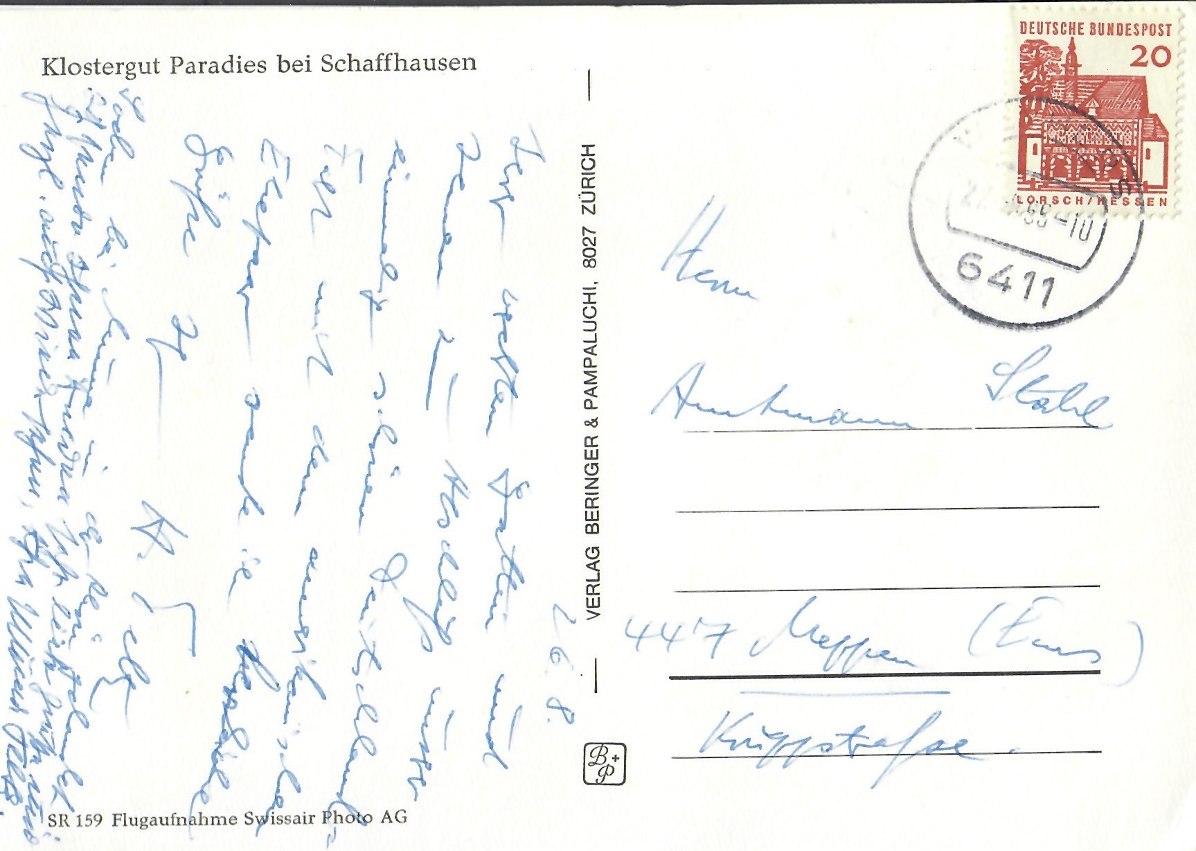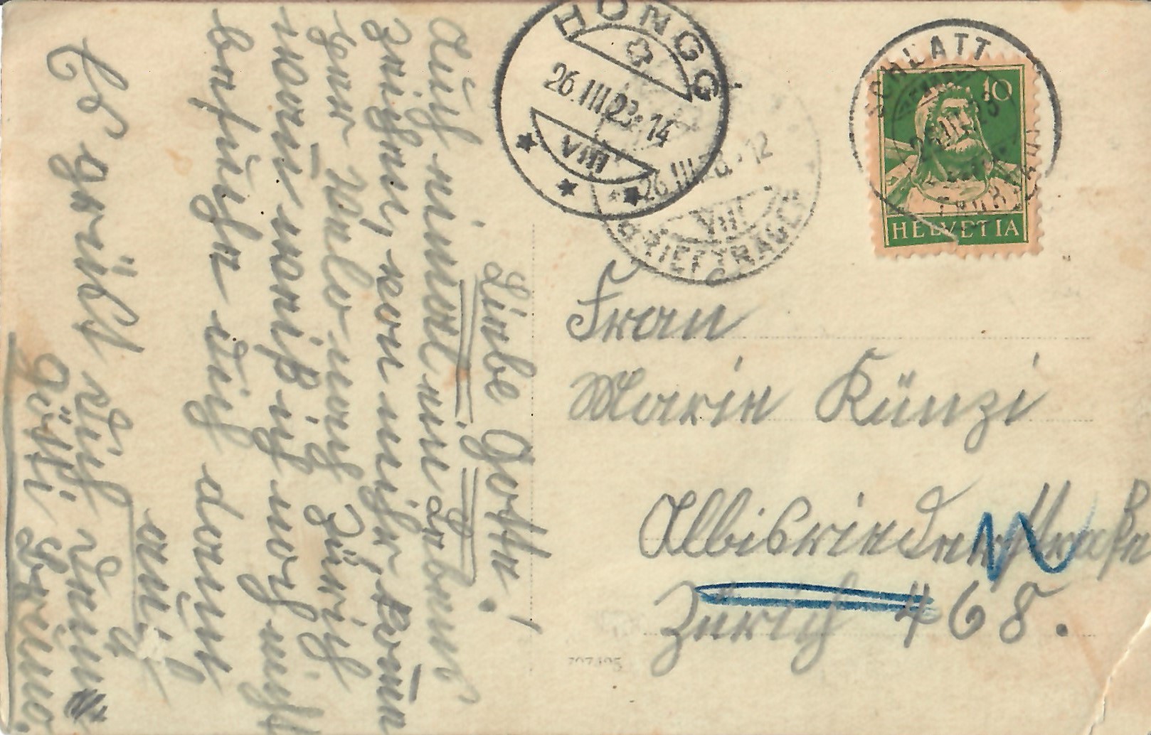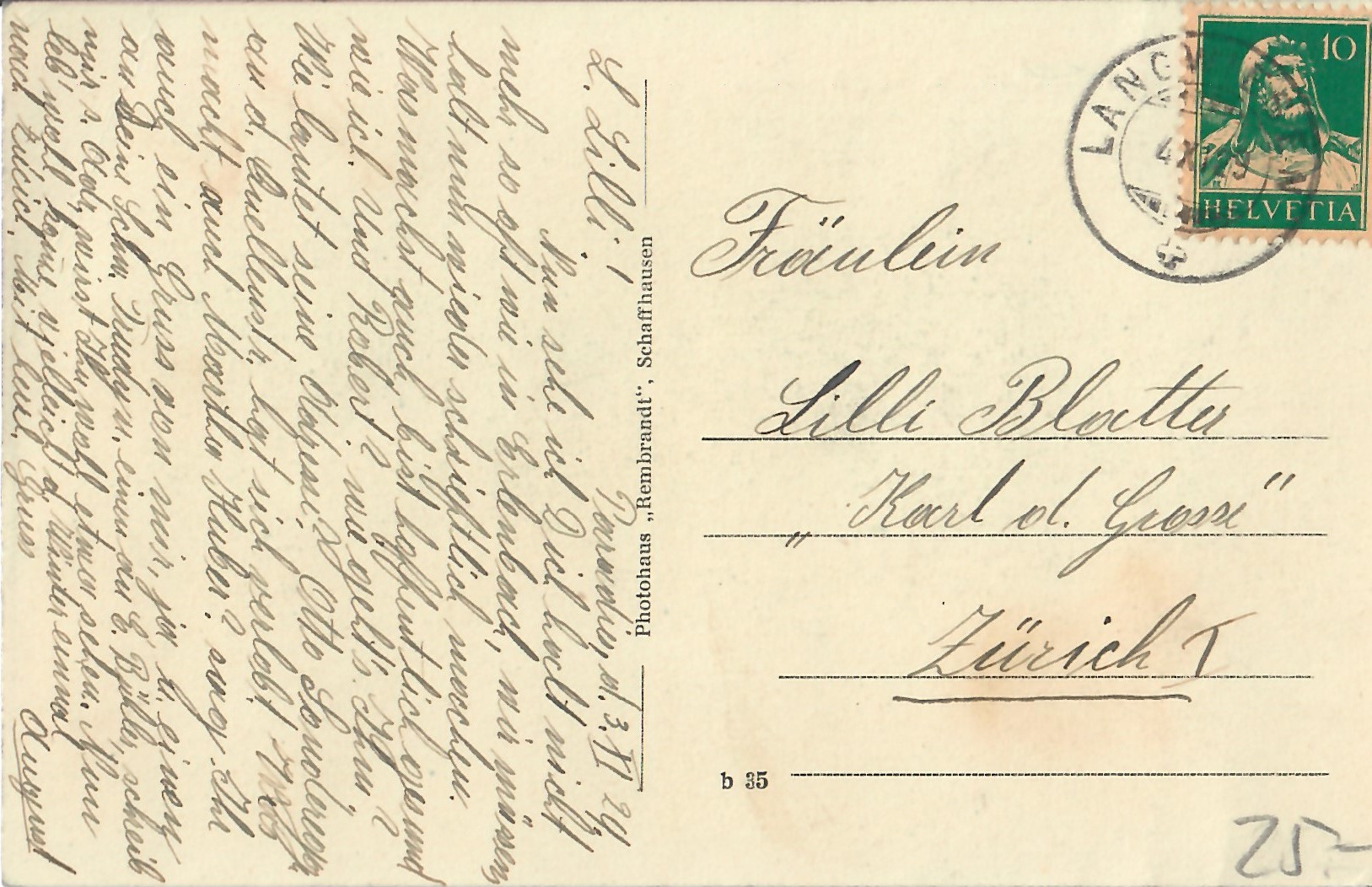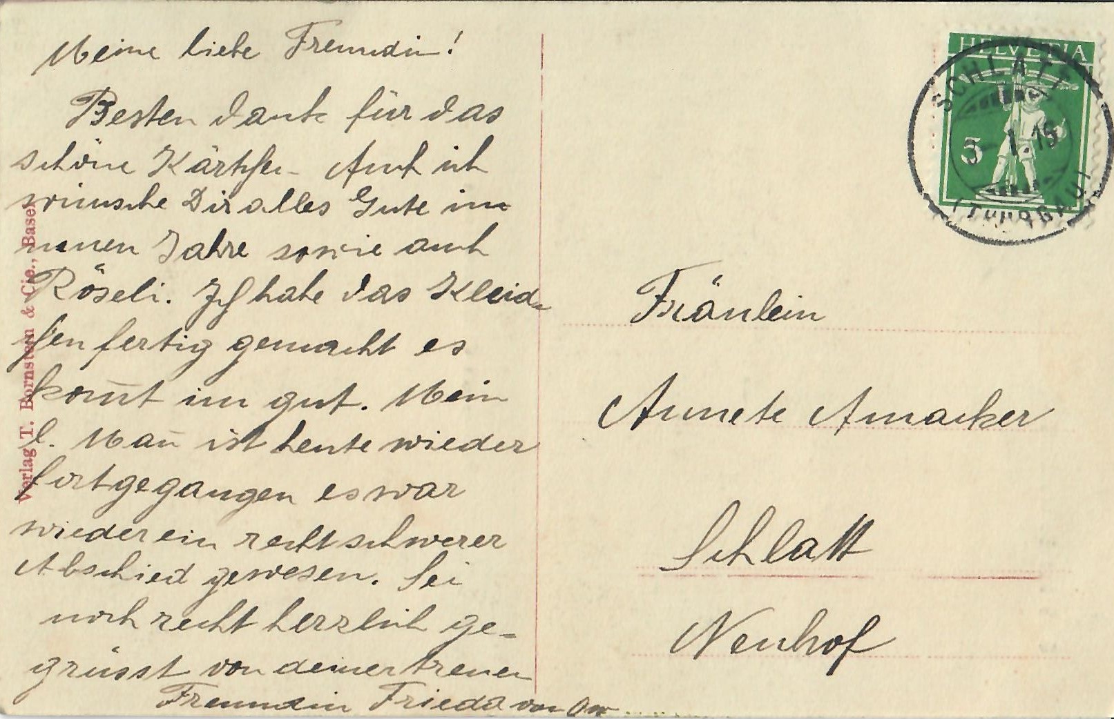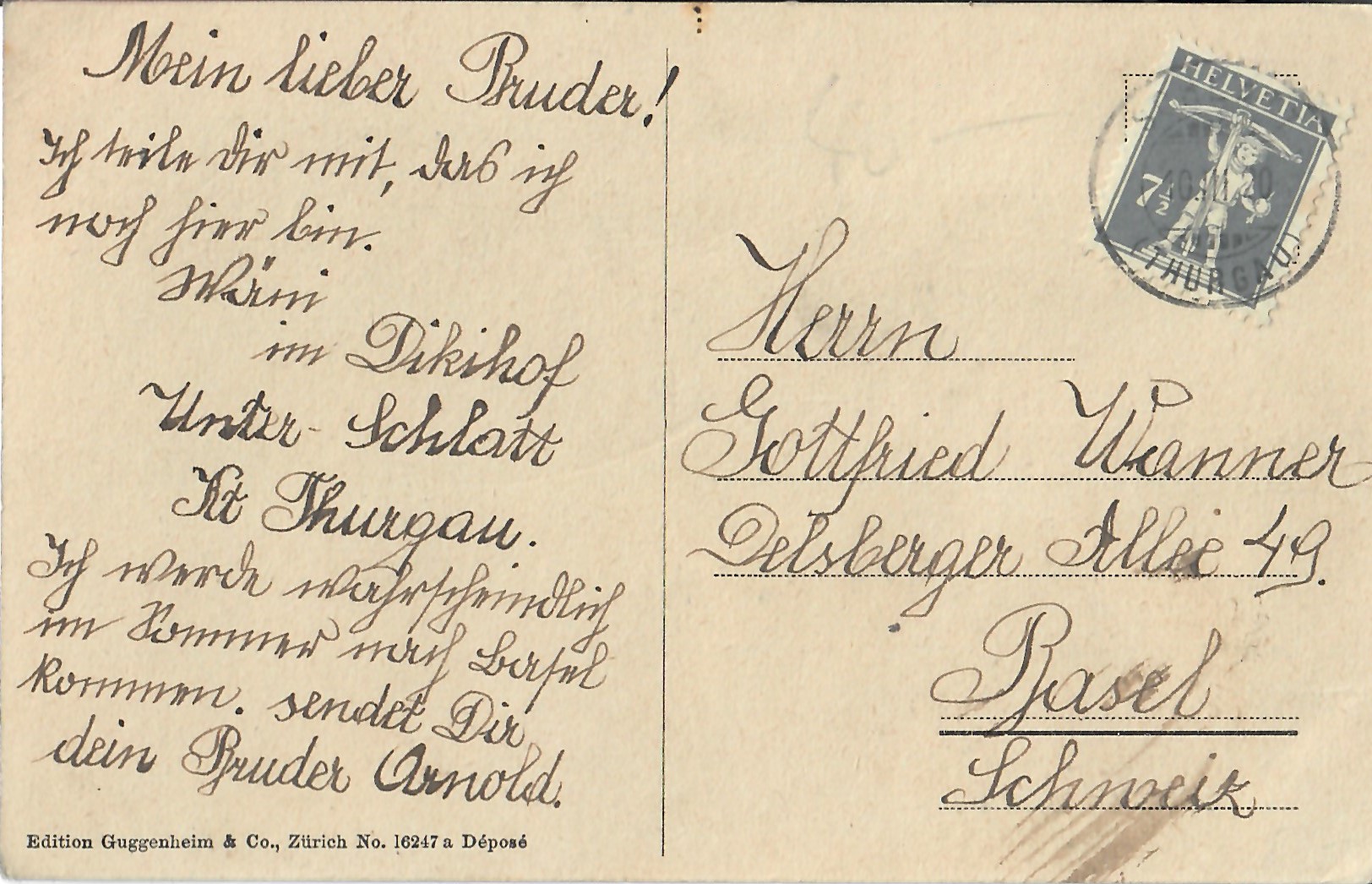 In diesem Kapitel sehen Sie historische Ansichtskarten mit Sujets aus dem Gemeindegebiet von Schlatt. Die Karten sind teilweise über 100 Jahre alt. Sie wurden in die ganze Welt verschickt. Den weitesten Weg hinter sich hat eine Karte, welche bis nach Pittsburg, USA, und wieder zurück fand. Ansichtskarten hatten früher die Funktion, welche heute SMS oder whatsapp Nachrichten übernehmen. Man schickt sich schnell eine Nachricht wie; "Hallo es geht mir gut", "Ich komme um 15.30 Uhr bei euch an" oder "Hier meine neue Adresse" und ähnliches. Bemerkenswert ist, dass innerhalb der Schweiz versendete Ansichtskarten schon vor mehr als 100 Jahren bereits nach einem Tag bei dem/der Empänger/in ankamen! Hier sehen Sie die Sammlung B. Möckli. Diese wird laufend erweitert und ergänzt.