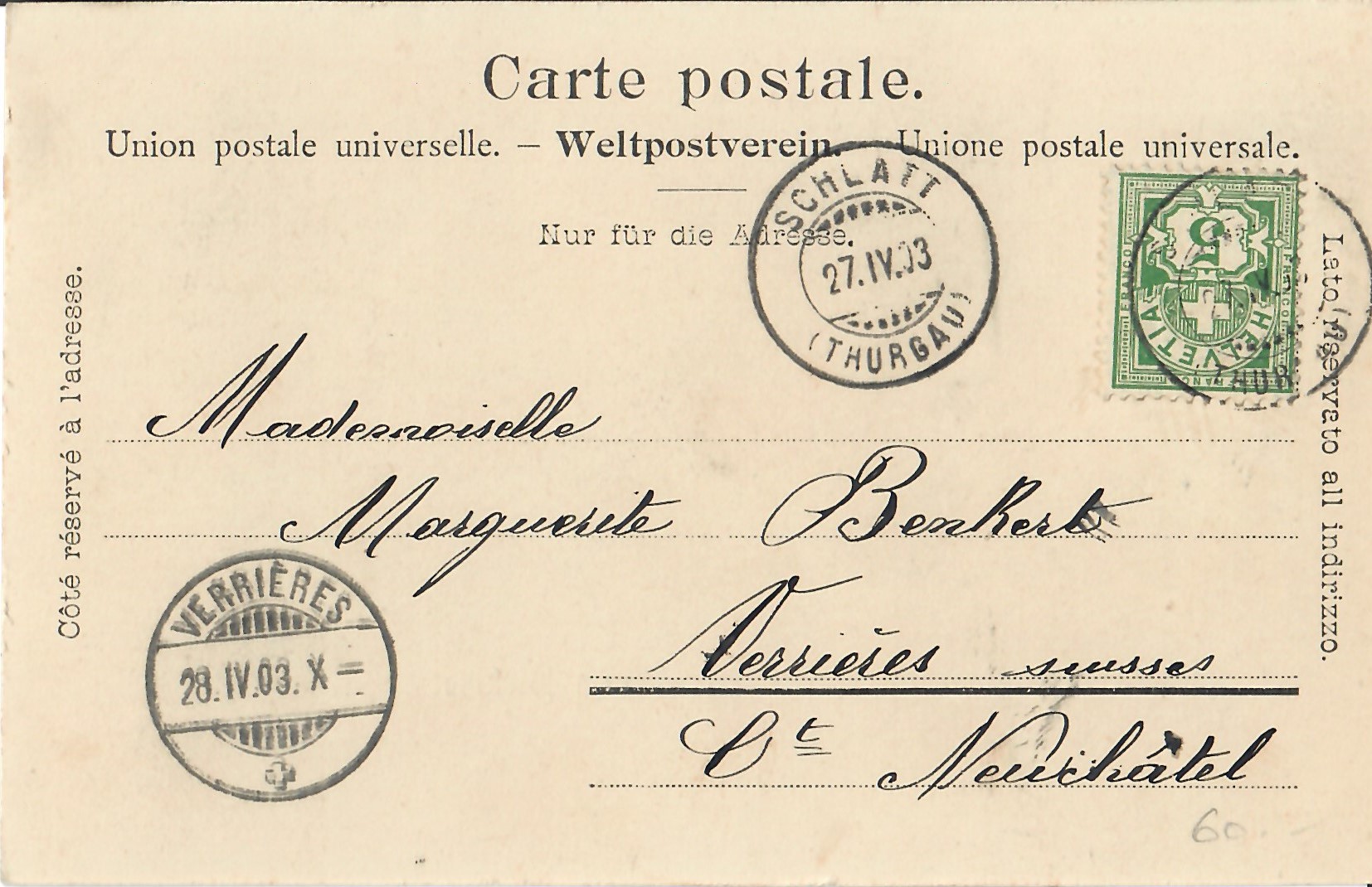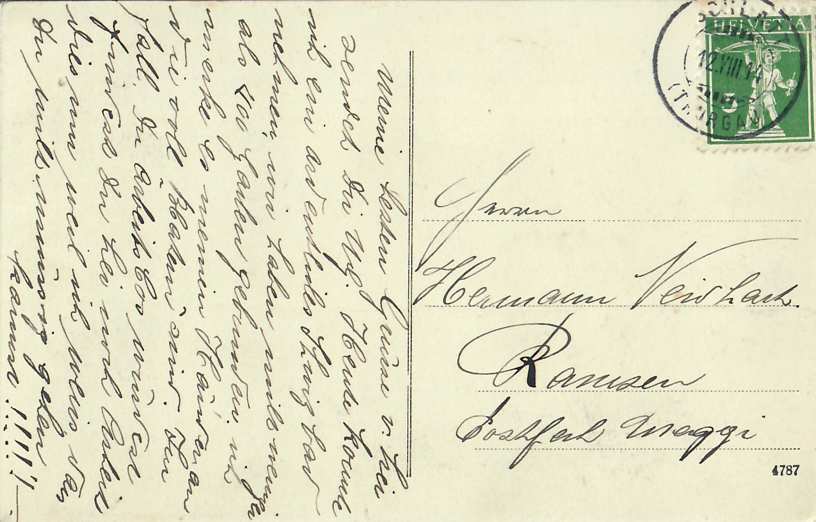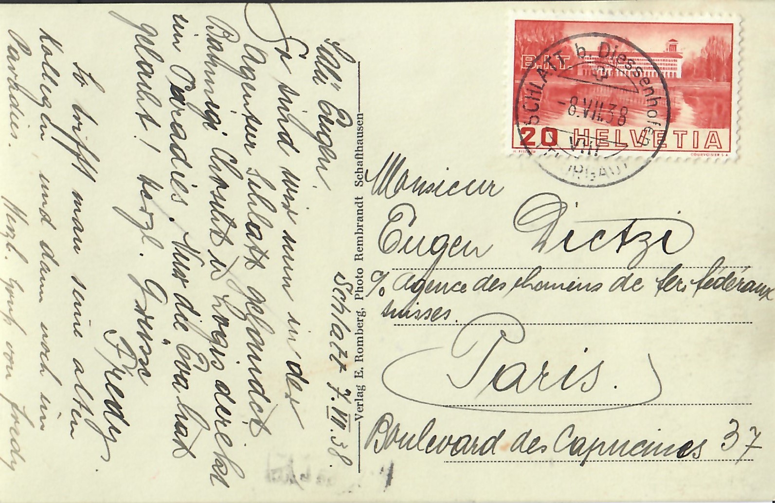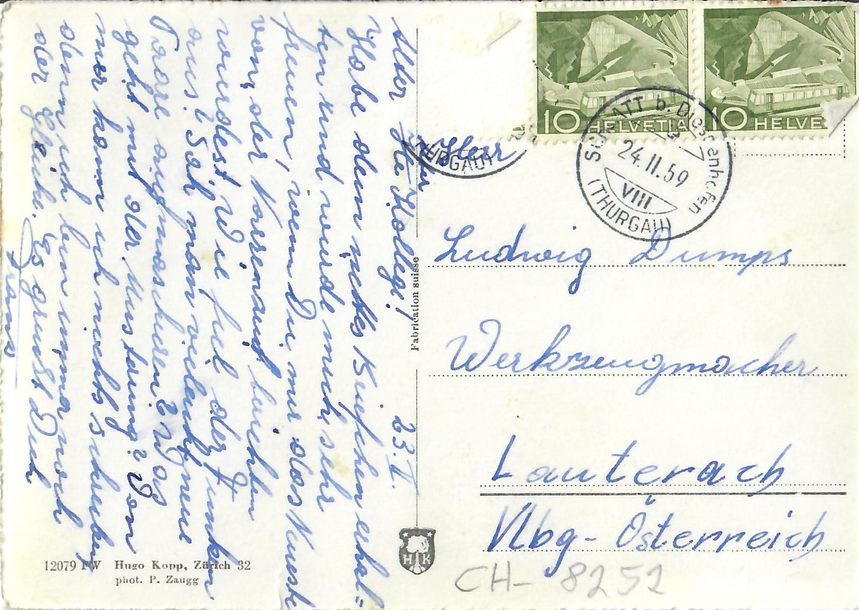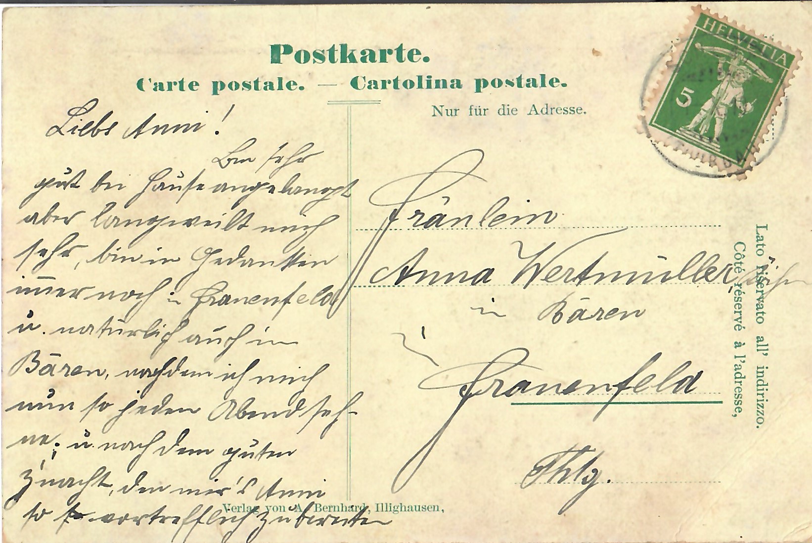 In diesem Kapitel sehen Sie historische Ansichtskarten mit Sujets aus dem Gemeindegebiet von Schlatt. Die Karten sind teilweise über 100 Jahre alt. Sie wurden in die ganze Welt verschickt. Den weitesten Weg hinter sich hat eine Karte, welche bis nach Pittsburg, USA, und wieder zurück fand. Ansichtskarten hatten früher die Funktion, welche heute SMS oder whatsapp Nachrichten übernehmen. Man schickt sich schnell eine Nachricht wie; "Hallo es geht mir gut", "Ich komme um 15.30 Uhr bei euch an" oder "Hier meine neue Adresse" und ähnliches. Bemerkenswert ist, dass innerhalb der Schweiz versendete Ansichtskarten schon vor mehr als 100 Jahren bereits nach einem Tag bei dem/der Empänger/in ankamen! Hier sehen Sie die Sammlung B. Möckli. Diese wird laufend erweitert und ergänzt.